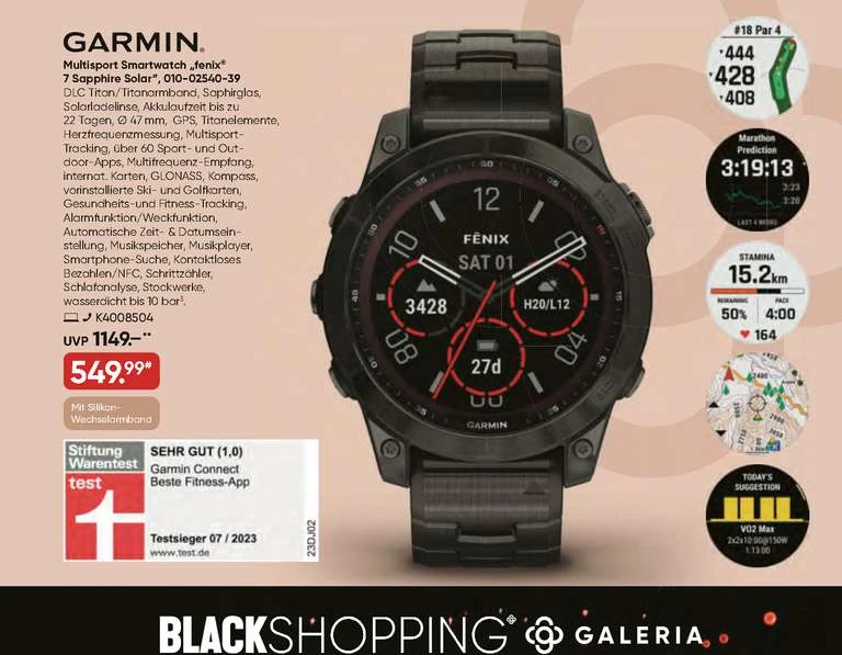 Bei erhaltet ihr ab 20.11. als Black Shopping-Angebot die Garmin Fenix 7 Sapphire Solar slate grey dlc titan/dlc titan für 549,99€+ VSK statt bzw. (globetrotter)
