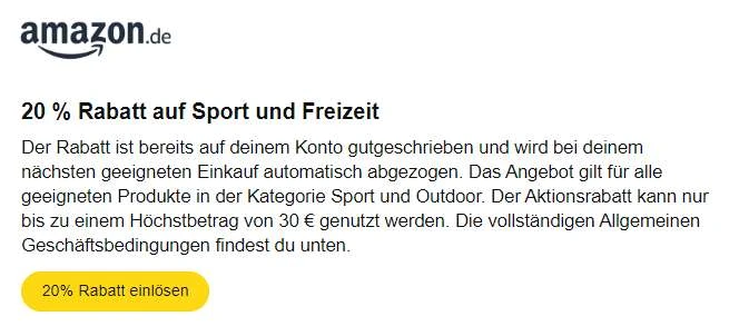20 % Rabatt auf Sport und Freizeit, alle die berechtigt sind, müssten eigentlich ne Mail bekommen haben.