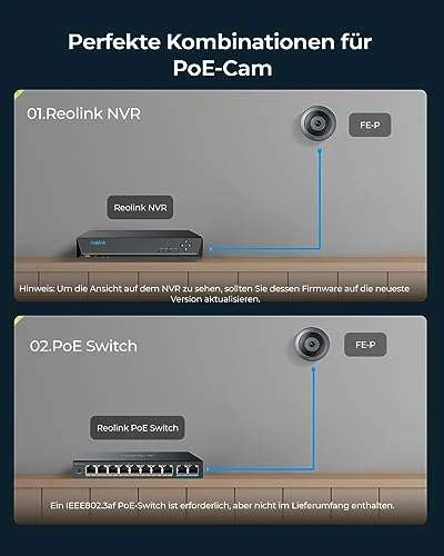 - POE SETUP & NVR ANSCHLUSS: Dank der Power-over-Ethernet-Technologie sorgt ein einziges Netzwerkkabel für die Daten, den Ton und die Stromversorgung von FE-P. Und Reolink NVR stellt eine bequeme Lösung zum erleichterten Speichern & Verwalten dar.