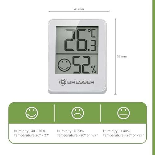 THERMOMETER HYGROMETER: Mit dem Bresser Thermometer Hygrometer haben Sie stets die Kontrolle über das Raumklima. Sie messen präzise die Innenraumtemperatur & die Luftfeuchtigkeit – ideal zur Schimmelvorbeugung