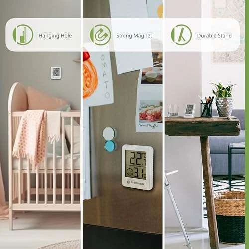 MEHRFACHE MONTAGEOPTION: Die Thermometer sind vielseitig einsetzbar. Dank der Wandmontage, dem Standfuß und des Magneten können sie überall platziert werden