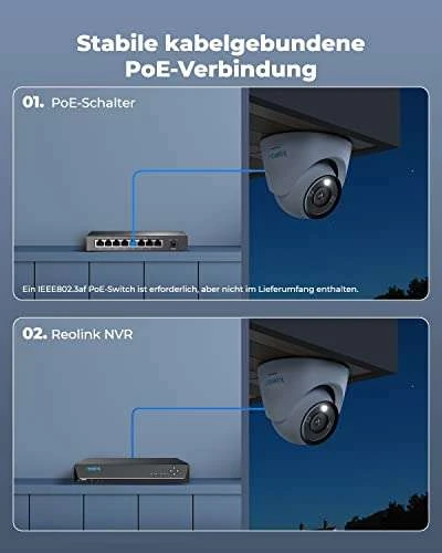 - PLUG UND PLAY: Die Power over Ethernet-Technologie ermöglicht die Übertragung von Videos und die Stromversorgung der Kamera über ein einziges Netzwerkkabel, so dass sie in kürzester Zeit installiert werden kann. Die kostenlose Reolink App/Client mit einfach zu bedienender Funktion sorgt für eine unkomplizierte Einrichtung der Kamera.