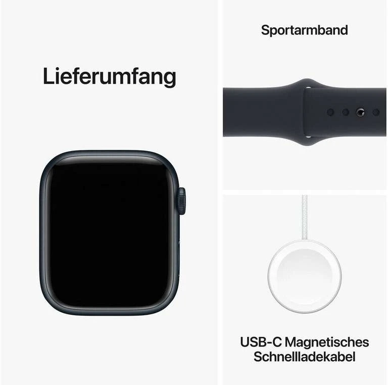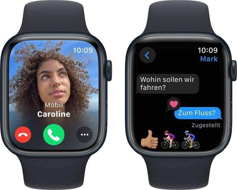 - BLEIB IN VERBINDUNG – Sende unterwegs eine Textnachricht, mach einen Anruf, hör Musik und Podcasts, verwende Siri und erhalte Mitteilungen. Die Apple Watch Series 9 (GPS) funktioniert mit deinem iPhone und im WLAN, damit du in Verbindung bleibst.