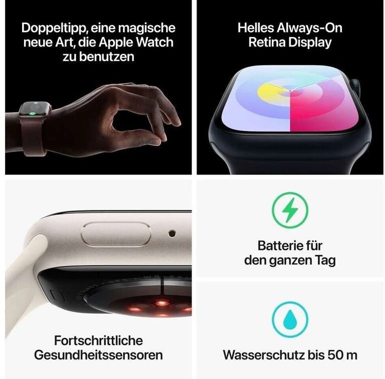 - WARUM APPLE WATCH SERIES 9 – Das ultimative Tool für ein gesundes Leben kann jetzt noch mehr. Der S9 Chip ermöglicht ein superhelles Display und eine magische neue Geste, um schnell und einfach mit deiner Apple Watch zu interagieren, ohne das Display zu berühren. Fortschrittliche Features für Gesundheit, Sicherheit und Aktivität liefern wichtige Einblicke und rufen Hilfe, wenn du sie brauchst. Und überarbeitete Apps in watchOS geben dir mehr Infos auf einen Blick.