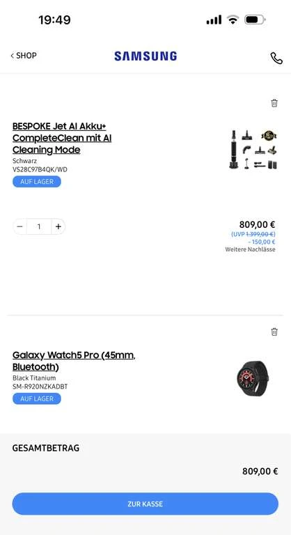 959€ minus 150€ sofort Abzug gleich 809€ minus Gratiszugabe Galaxy Watch5 Pro (45mm, Bluetooth)