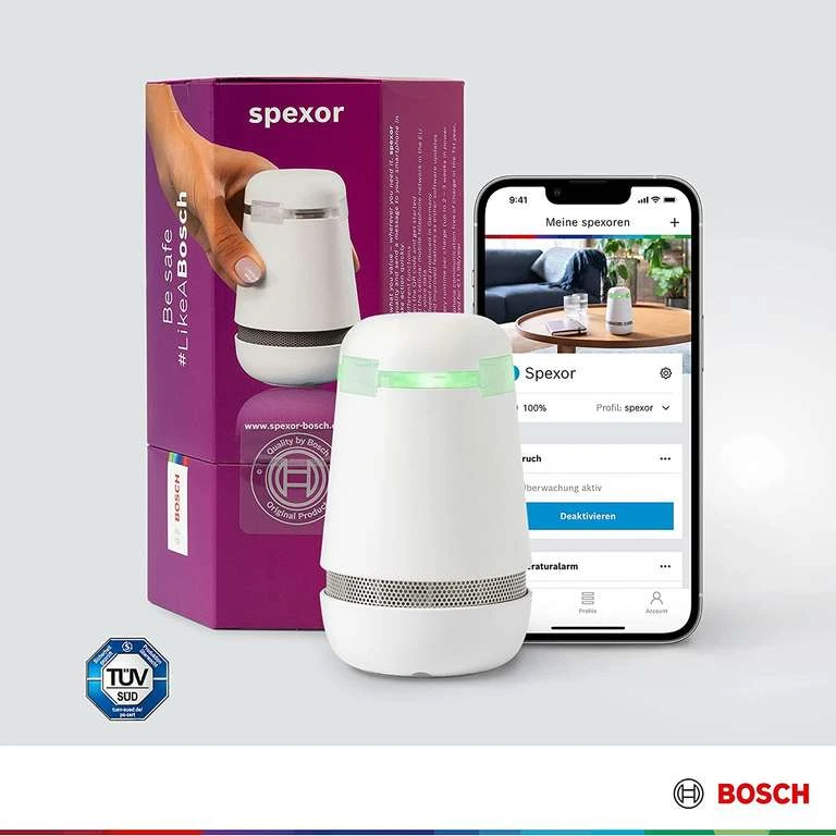 - Brandgaserkennung: Brände entstehen oft unbemerkt und gehören zu den größten Gefahren im Haushalt. Brände entwickeln neben Rauch oft auch Gase, die sich mit der Umgebungsluft vermischen und gesundheitsgefährdend sein können. Dank eines Sensors erkennt der Bosch spexor diese Gase in der Luft und kann Dich bei Rauchentwicklung rechtzeitig warnen. Nach der 14-tägigen kostenlosen Testversion erhältst Du die Funktion in der App im Jahresabo.