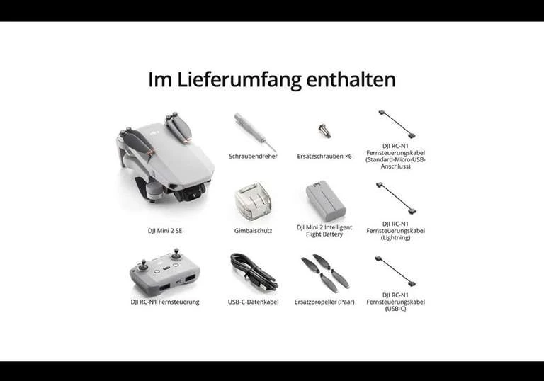 DJI Mini 2 SE ist in zwei Versionen erhältlich. DJI Mini 2 SE: Die Standardversion enthält die Mini 2 SE Drohne, die RC-N1 Fernsteuerung und alles Zubehör, das zum Fliegen benötigt wird. Die DJI Mini 2 SE Fly More Combo enthält zusätzlich zwei Intelligent Flight Batteries, zwei Paar Ersatzpropeller, eine Umhängetasche, eine Zweiwege-Ladestation und einen Propellerhalter.