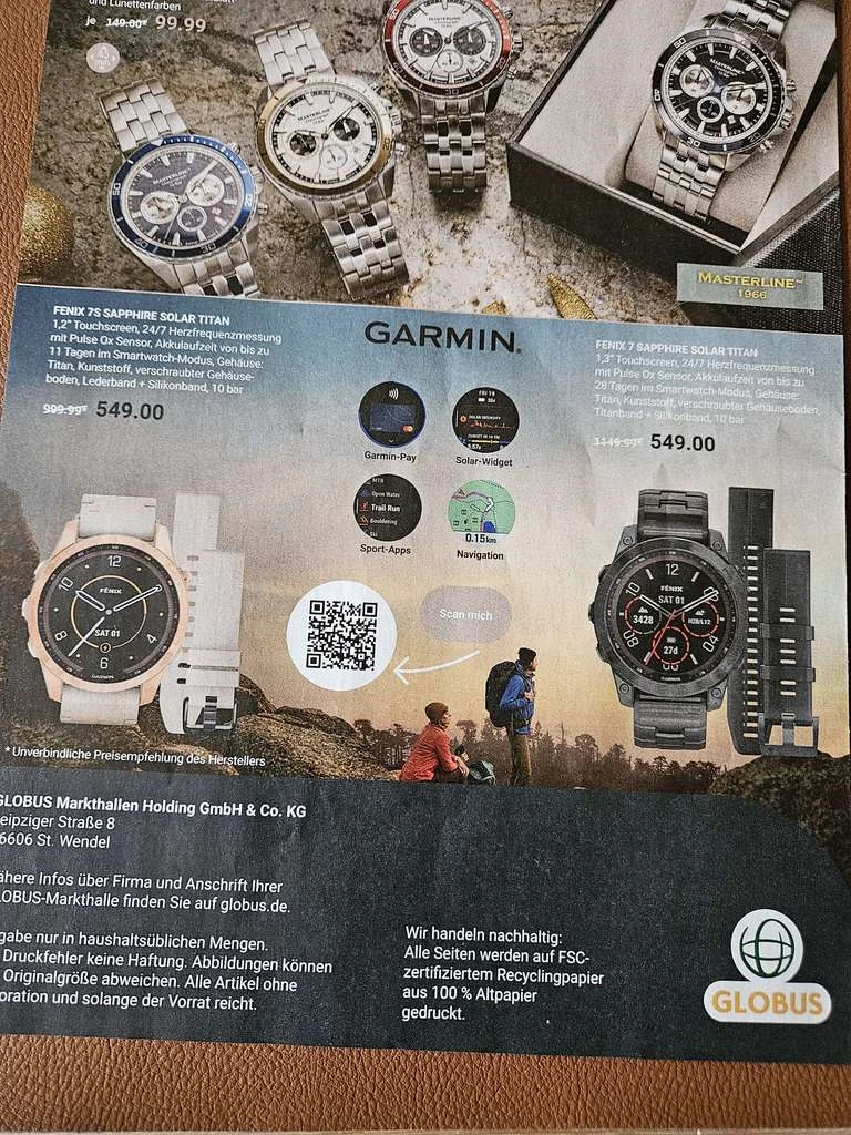 Ab 27.11.2023 verkauft Globus die Fenix 7s Sapphiere Solar Titan rose gold für 549,00 € .Es ist eine sehr schöne Frauenuhr die etwas kleiner als die normale Fenix7 ist . Bisher habe ich nur die größere Fenix 7 Sapphiere Solar Titan für diesen Preis gefunden (die es hier auch gibt) Die 7s in dieser Ausstattung und Farbe habe ich nicht günstiger als 989,90 €bei einen Händler gefunden.Gebraucht und weniger Ausstattung ab 580 ebay oder799 nur Solar .DasProspekt von Globus ist extra für Abteilung Glanzpunkt . Da es direkt von Globus ist hoffe ich für alle das es Bundesweit gilt .Die Fenix 7mit Solar , Sapphire Glas und Titan ist für mich da ich öfters irgendwo anschlage und der sehr langen Acculaufzeit die zur Zeit beste Wahl .