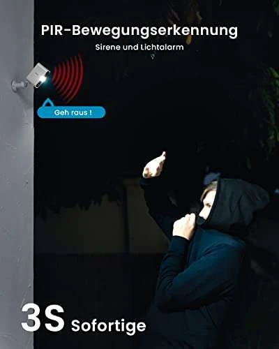 - 【2K QHD und Farbige Nachtsicht】Die 2K-Ultra-High-Definition-Auflösung bringt Ihnen eine klarere visuelle Qualität und eine reibungslosere Live-Übertragung. Die eingebaute Infrarot-LED und das externe Weißlicht der überwachungskamera aussen akku sorgen für eine hervorragende Nachtsicht bis zu 10 m und bieten Ihnen Rundumschutz bei Tag und Nacht.