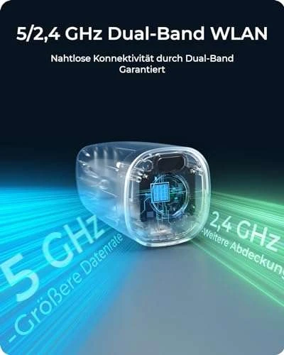 - 2,4/5GHz WLAN-KONNEKTIVITÄT: Diese Kamera unterstützt sowohl 2,4GHz- als auch 5GHz-WLAN. Wählen Sie 2,4GHz für stabilere Verbindung oder 5GHz-WiFi für schnellere Geschwindigkeit. Entscheiden Sie sich je nach Installationsort der Kamera für das geeignetste WLAN-Band.