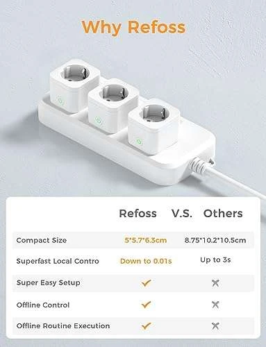 - Zuverlässige und stabile lokale Steuerung: Mit unserer intelligenten Steckdose können Sie die Funktionen wie Ein-/Ausschalten, Zeitplanung, Fernbedienung usw. der Steckdose von Ihrem lokalen Gerät aus steuern. Sie müssen sich keine Sorgen um die Netzwerkverzögerung oder die Stabilität des Cloud-Services machen. Bei der persönlichen Privatsphäre jedes Benutzers bietet die Refoss intelligente Steckdose einen höheren Sicherheitsschutz.