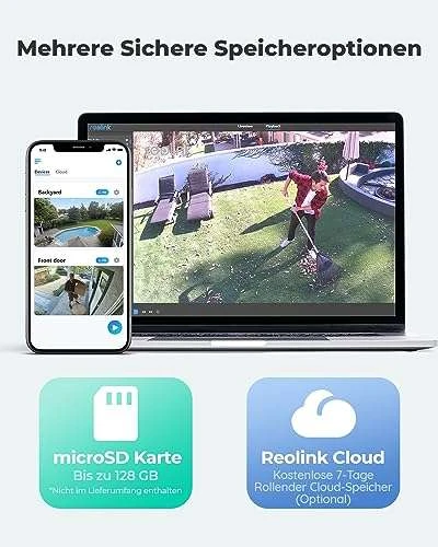 - FERNZUGRIFF UND ZWEI-WEGE-AUDIO: Sie können Ihr Zuhause oder Geschäft überall live sehen, hören, mit Ihren Kindern, Mitarbeitern oder Zustellern interaktiv sprechen. Bewegungsvideos werden auf einer Micro-SD-Karte(bis zu 128GB, separat erhältlich) gespeichert und können direkt über die Reolink-Software (App/Client) abgespielt werden. OHNE Abo-Gebühr.