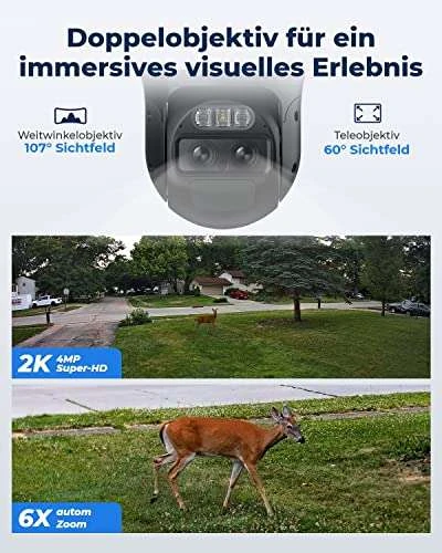 Reolink PTZ Überwachungskamera Aussen Akku mit Auto-Tracking, 6X Hybridzoom, Dual Lens, 4MP Solar WLAN Kamera Outdoor, 2,4/5GHz WiFi, 30m Farbnachtsicht, KI-Erkennung, 360° View, TrackMix+Solarpanel