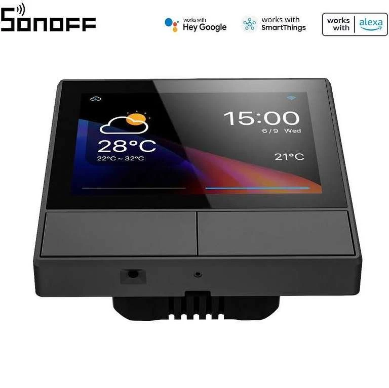 Die Zentraleinheit Sonoff NSPanel EU steuert die Kommunikation aller kompatiblen Geräte. Sie ermöglicht die Verbindung aller Sensoren und Schalter. Dazu gehören Bewegungs-, Temperatur-, Feuchtigkeits-, Rauch- und Türöffnungssensoren. Alle Einstellungen lassen sich bequem auf dem 3,5″ Touchscreen überwachen.