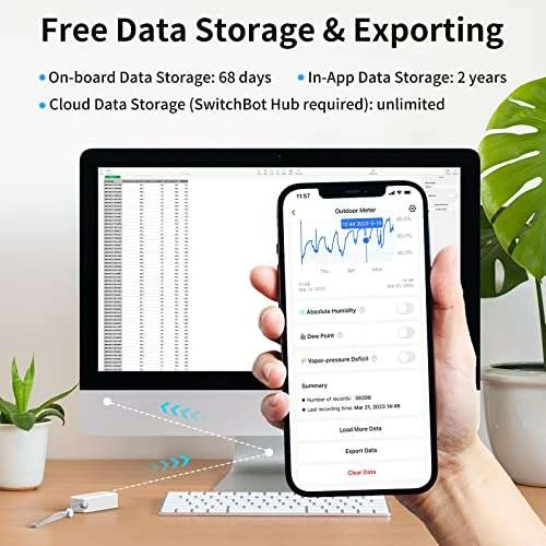 Unterstützt den Export von Daten: 120m Verbindungsdistanz (ohne Hindernisse) ermöglicht es Ihnen, die Temperatur und Luftfeuchtigkeit jährlich, monatlich, täglich oder stündlich schnell und klar zu überblicken. Genießen Sie bis zu 68 Tage On-Board-Datenspeicherung und bis zu 2 Jahre In-App-Datenspeicherung (unbegrenzter Cloud-Speicher, wenn SwitchBot Hub hinzugefügt wird). Daten können als .csv-Datei für eine tiefere Analyse Ihrer Umgebung exportiert werden.