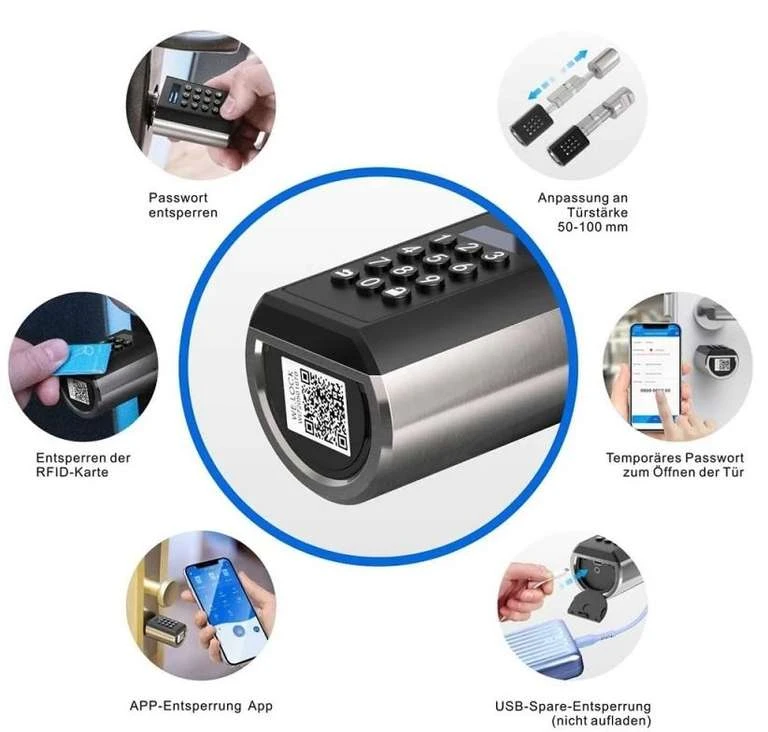Dieses elektronische Smart-Türschloss ist für alle Türen mit einer Dicke zwischen 50 mm und 100 mm geeignet. Einfacher Austausch des vorhandenen Schließzylinders in Ihrer Haustür oder Wohnungstür ohne Bohren.